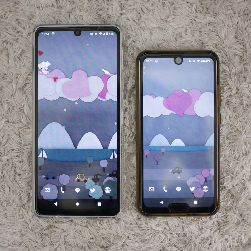 AQUOS sense6(左)と AQUOS R2 compact(右)。親子くらいの差がある。並べると OLED は高コントラスト。